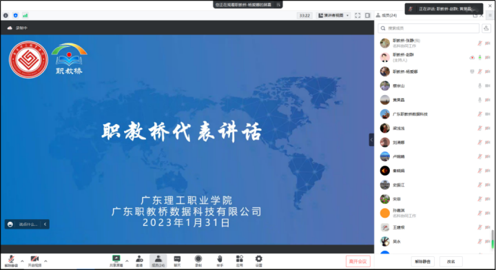 为推动双高计划中人才培养模式创新与课程体系构建任务并形成专业群教学标准,2023年1月31日,广东理工职业学院与广东职教桥数据科技有限公司携手召开了物联网应用技术专业群人才培养支持服务项目启动会议。